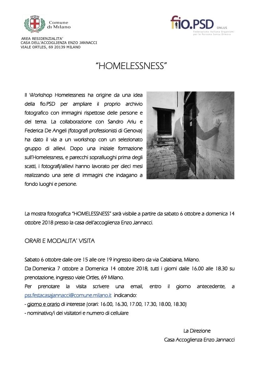 Sempre il 6 ottobre, alle ore 15.00, si inaugura a Milano la mostra Homelessness