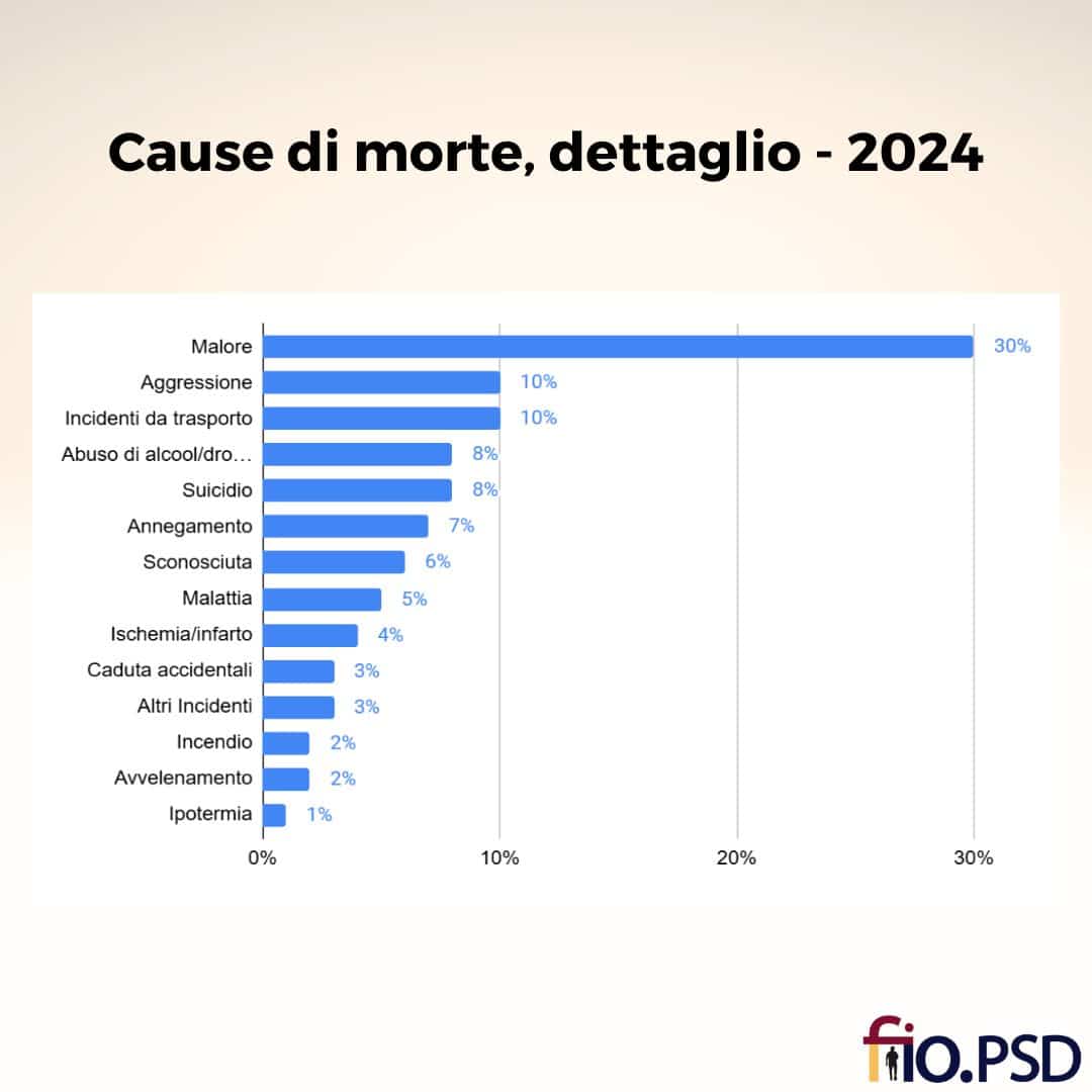 I numeri del 2024 evidenziano che quasi la metà dei decessi (47%) è attribuibile a eventi traumatici e accidentali, come aggressioni, incidenti e suicidi.