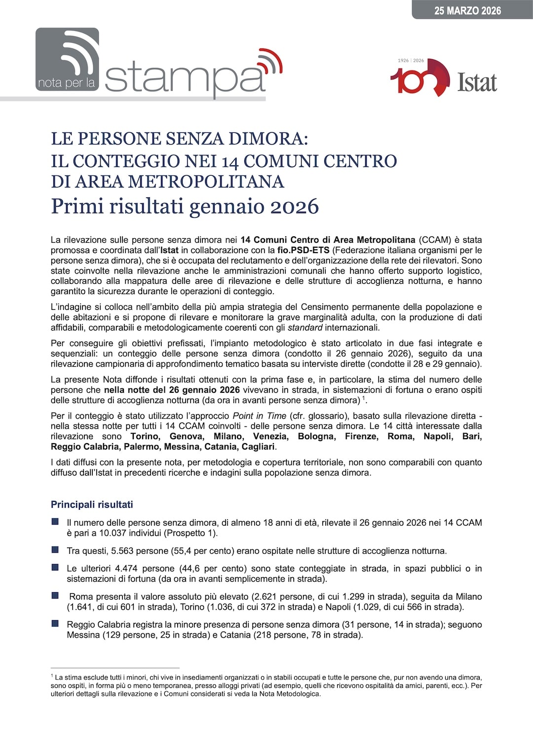 Oggi, 25 marzo 2026, alle ore 11:00, presso la Sala Stampa dell’Istat, si è svolta la Conferenza stampa di presentazione dei primi risultati della Rilevazione sulle Persone Senza Dimora realizzata nelle giornate 26, 28 e 29 gennaio 2026, nelle 14 città metropolitane (Bari, Bologna, Cagliari, Catania, Firenze, Genova, Messina, Milano, Napoli, Palermo, Reggio di Calabria, Roma, Torino, Venezia).